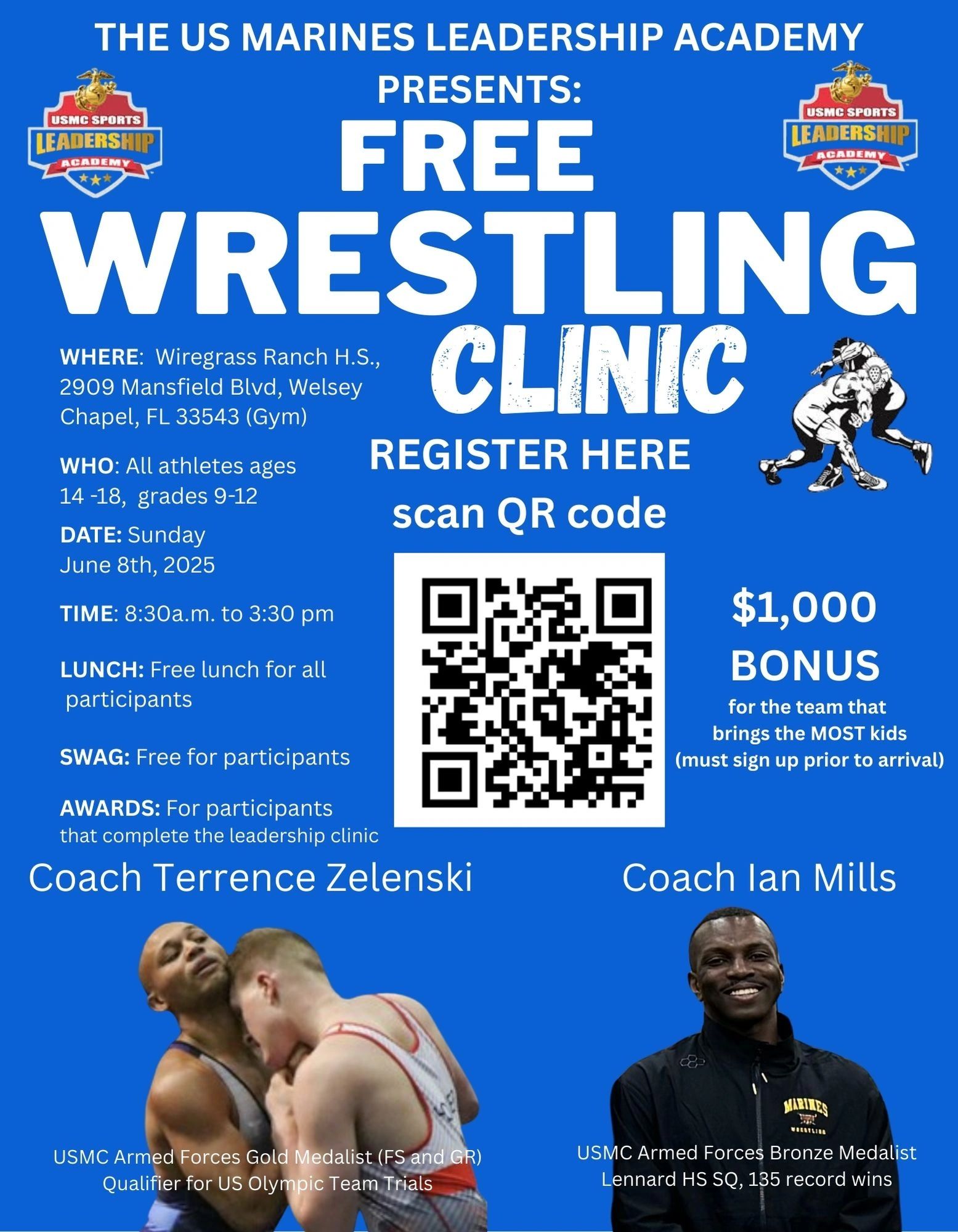 We just cant provide a better opportunity than FREE training, free food, free swag and did we mention this is an AWESOME DAY OF WRESTLING? We have acquired the help of the Marine Corps Leadership Academy and will offer all HIGH SCHOOLERS a 1-day TOTALLY free training camp. And the team with the most kids will receive