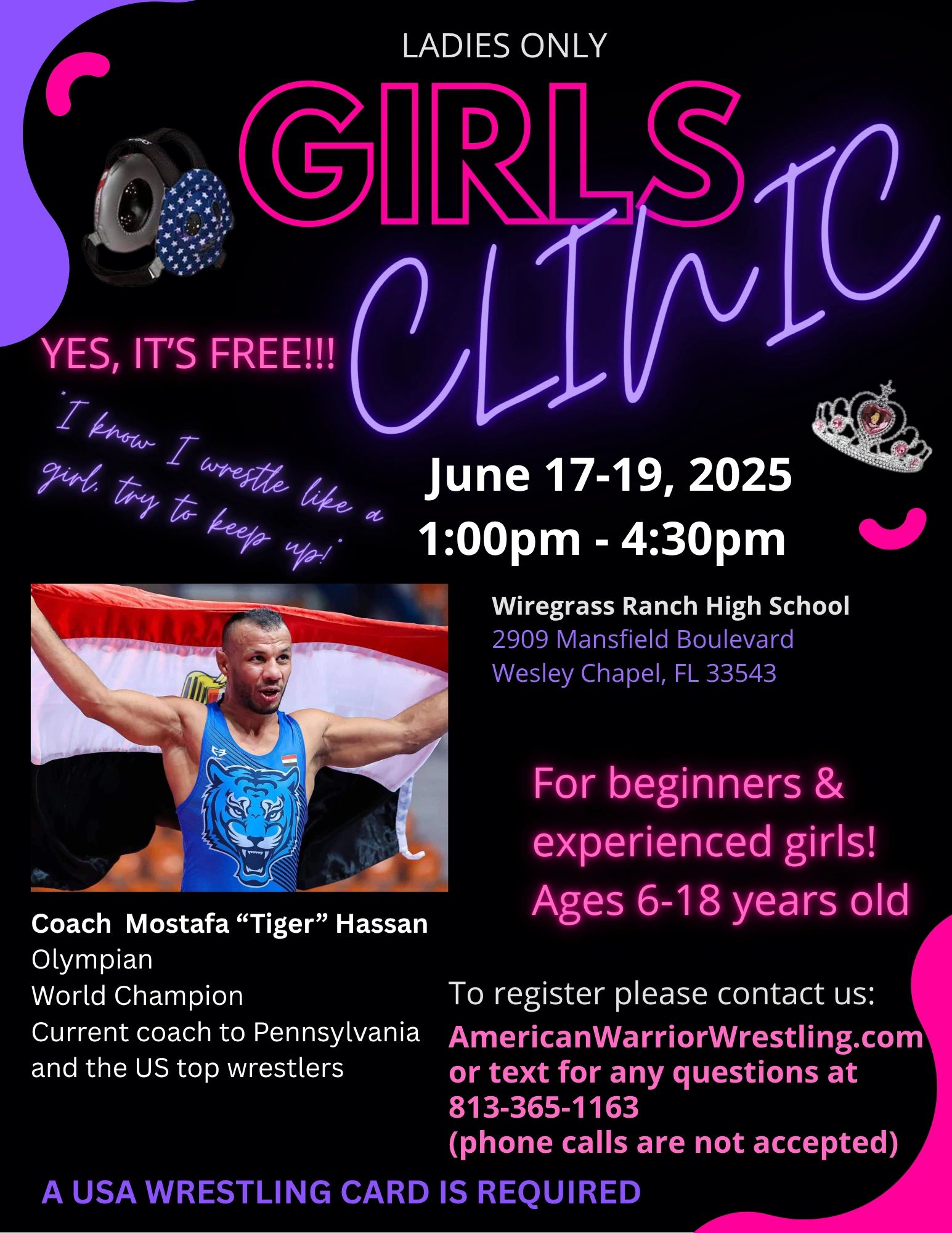 We are excited to announce the dates for our 2025 ALL-GIRLS girls clinic. This clinic will place special emphasis on wrestling and reintroduce the fundamentals to the first year girls. It builds the muscle memory for the returners to include some of the best technique to prepare girls for either a successful high sch
