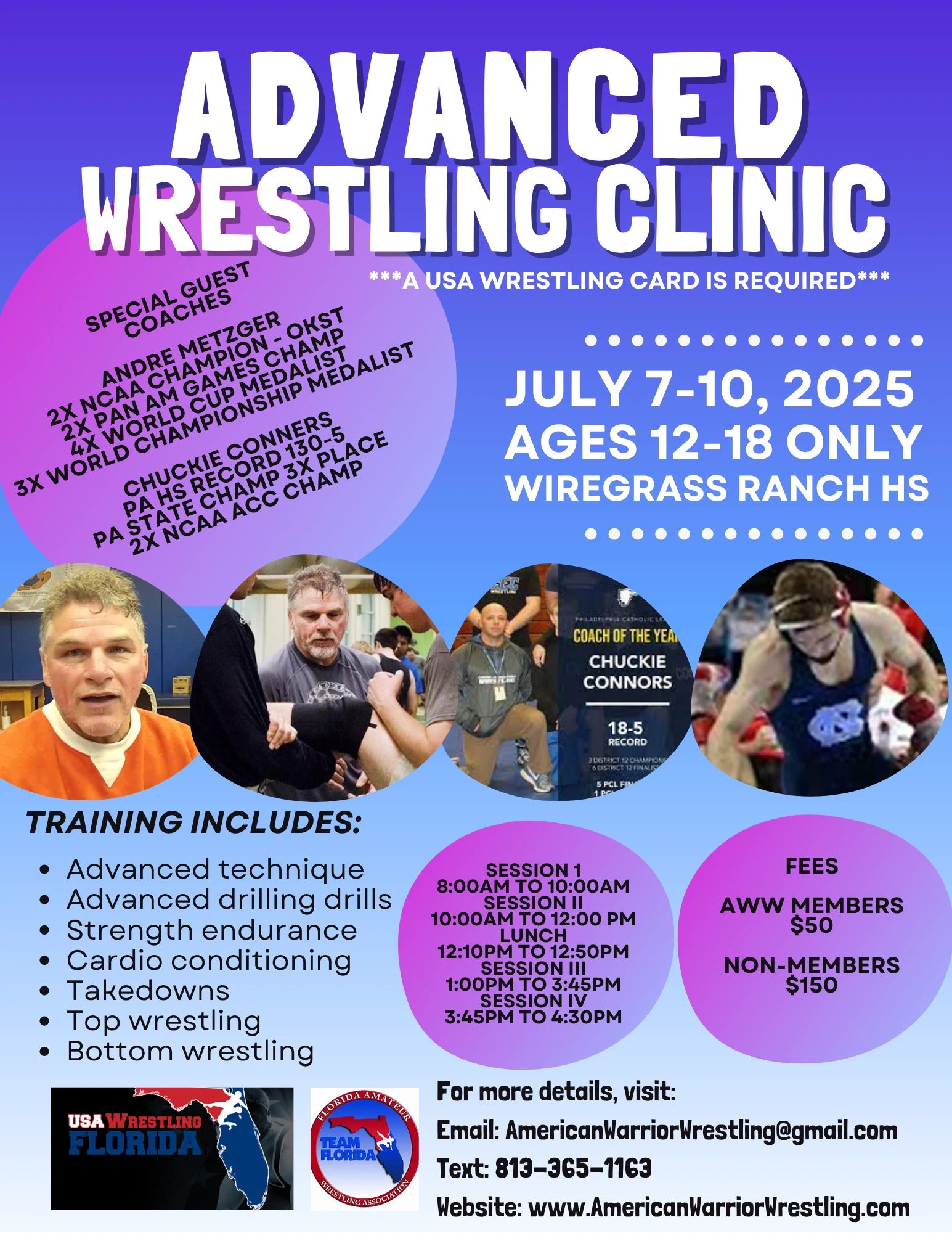 We had such a great success with last years advanced clinic, we are doing it again! Returning again this year is World and NCAA Champ Andre Metzger. And from Pennsylvania, PA State Champ, 3X PA State Place and NCAA 2x ACC Champ, Coach Chuckie Connors. These two are changing athletes careers every day. Come find out